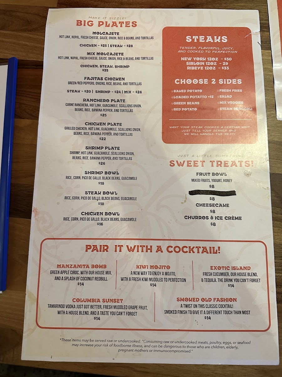 Hotlink, nopal, fresh cheese, sauce, onion, rice & beans, and tortillas. Chicken, steak and shrimp.